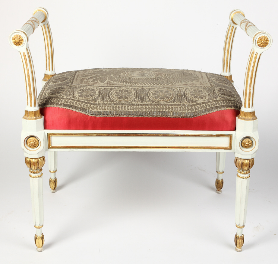 En el testero, tras una ligera consola procedente de la Real Casa del Labrador, colgaba una alfombra tapiz semejante a la pintura del techo del despacho del palacio madrileño de Manuel Godoy, cuyo diseño se debe a Juan de Mata Duque (aquí), que pudo ingresar en las Colecciones Reales con la enajenación de los bienes del favorito, al igual que los bustos de Carlos IV y María Luisa de Parma, por Juan Adán.