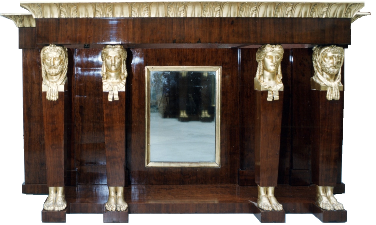 En las consolas fernandinas de los testeros, flanqueados por candelabros, quedaban representados los principales mecenas de Goya en los bustos de Carlos IV y María Luisa de Parma, por Juan Adán, concluidos en 1797 y 1799, respectivamente (aquí). Resulta simpático ver en medio de la sala una mesa velador con su centro, todo francés y en bronce dorado, con adorno de flores, que contribuirían a dar ambiente de época.