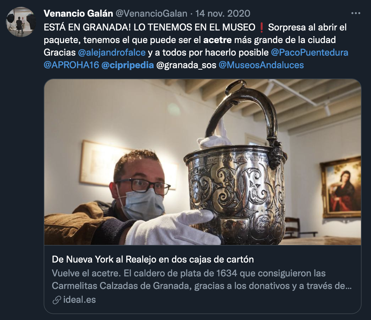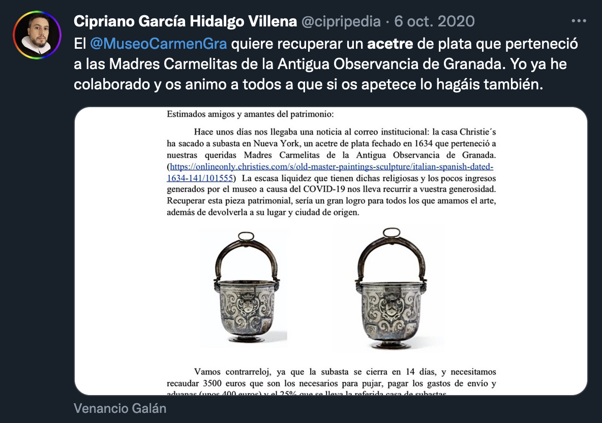 En octubre de 2020, la asociación negoció y firmó con los galeristas Carlton Hobbs un compromiso de venta con pago aplazado, de forma que tienen hasta octubre de 2022 para reunir 58.000 Euros y hacer frente al pago del precio de la pieza más gastos y tasas de importación.