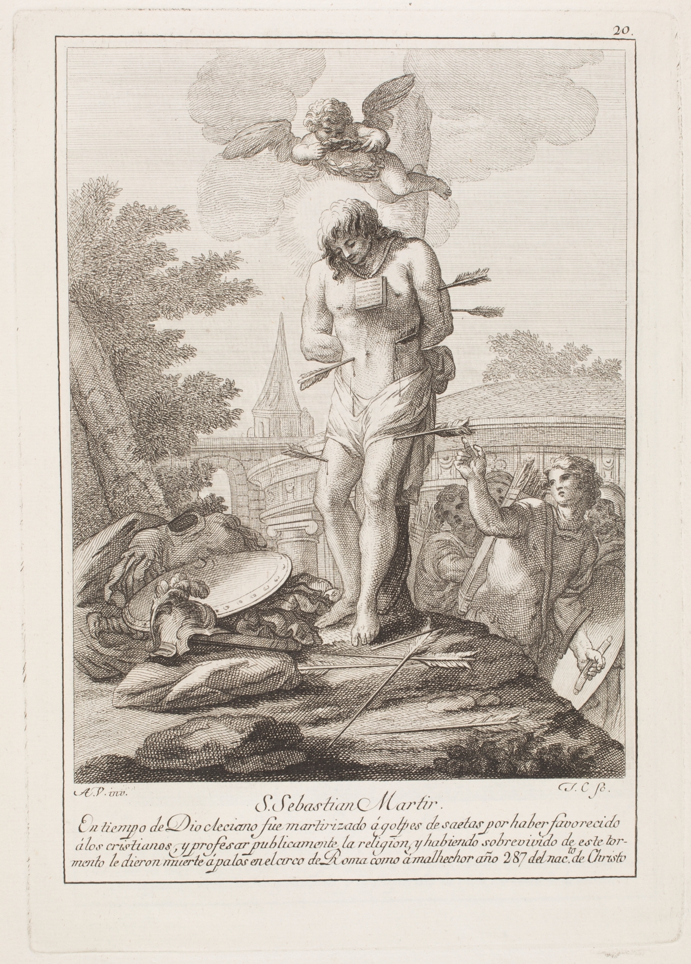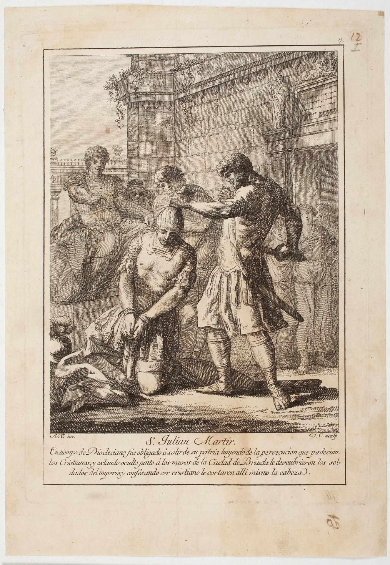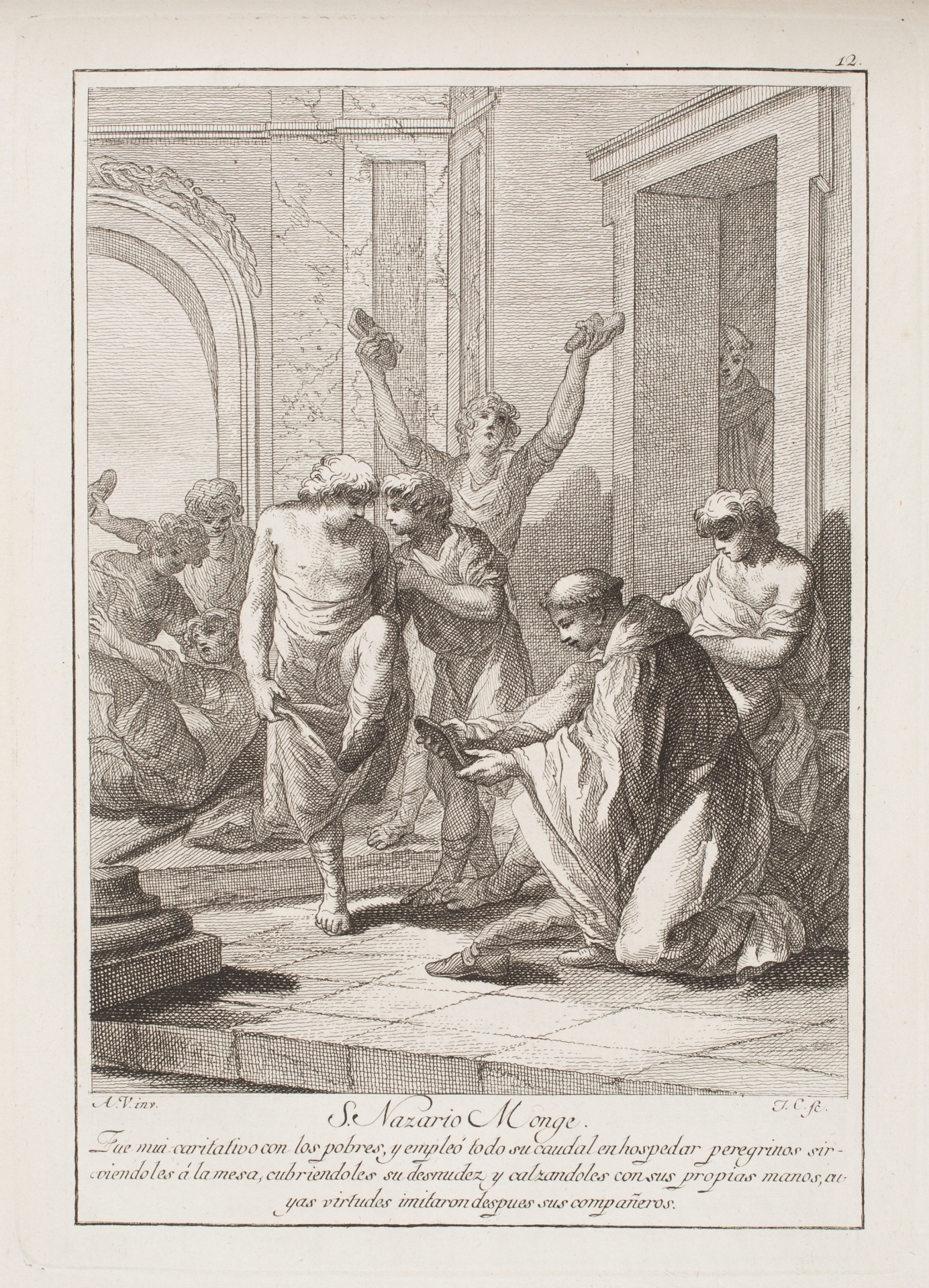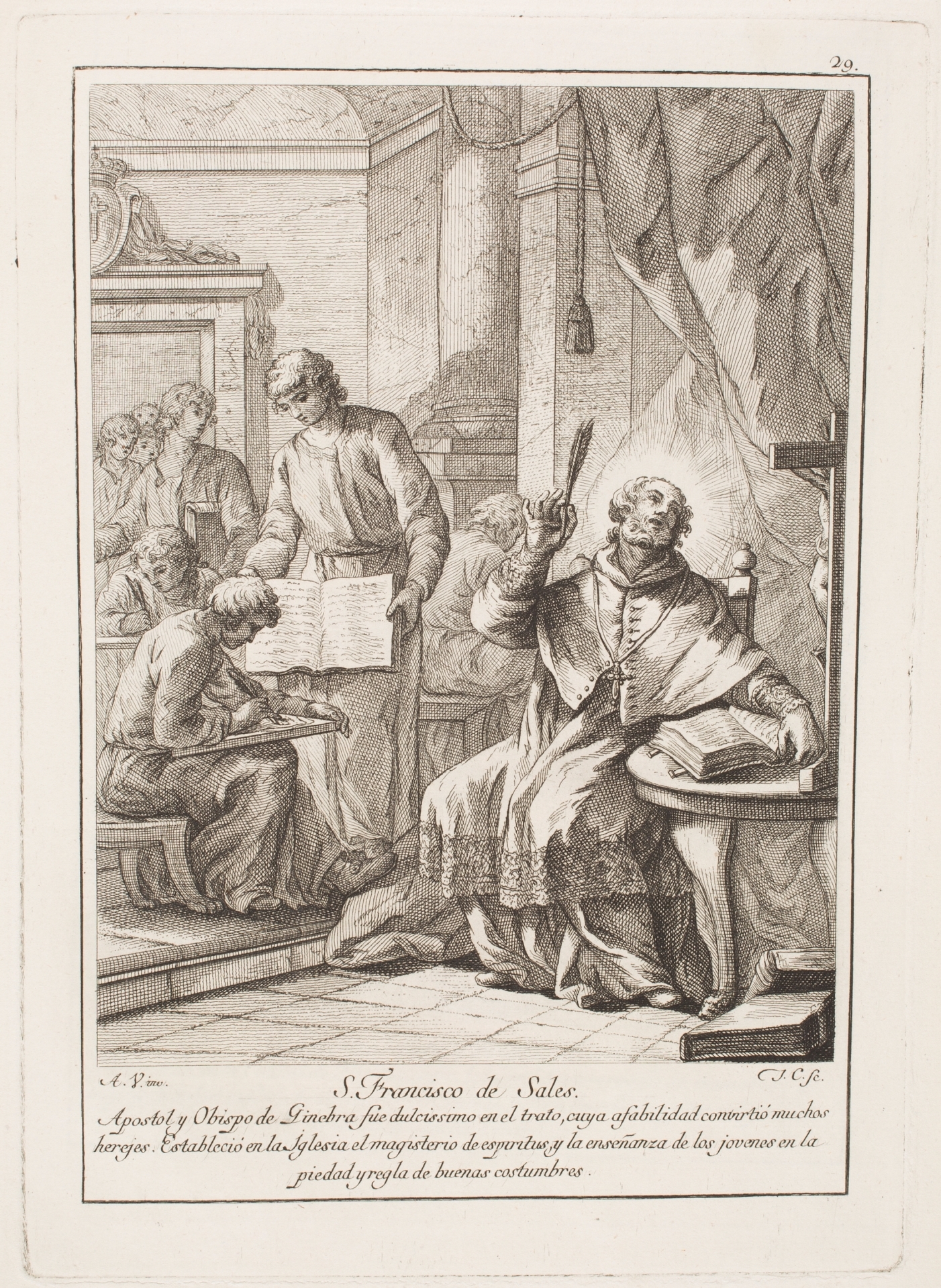 Durante la segunda mitad del siglo XVIII, gracias al enorme desarrollo que alcanzaron las artes gráficas en España, la representación de los santos fue un tema muy importante, no tanto en la ilustración de libros, como en la edición de estampas por separado que hacían referencia a diversos textos religiosos. Ese fue, por ejemplo, el caso concreto del Flos Sanctorum de Ribadeneyra para el que “se propuso hacer todos los [santos] del año… cada uno en lámina de mayor tamaño [que] de quartilla de la misma marca”[1]. La idea surgió del grabador Juan Antonio Salvador Carmona (1740-1805) y para llevarla a la práctica el artista Antonio González Velázquez (1723-1793), entre 1771 y 1773, realizó una serie de dibujos destinados a ilustrar Los Santos de los Días inspirándose en la descripción que de cada uno se daba en el Flos Sanctorum. Las estampas comenzaron a venderse en la librería de Bayló en la calle de Carretas entre agosto de 1779 y junio de 1780. Ambos artistas habían creído que podría ser un buen negocio, pero solo llegaron a imprimirse las estampas correspondientes a los treinta y un días del mes de enero y los diez primeros de febrero debido a “no haber correspondido la venta al coste de obra tan dilatada”[2]. Su precio de dos reales, un valor elevado en la época, pudo ser el motivo del escaso éxito. Algo que no tuvieron en cuenta Salvador Carmona y González Velázquez ya que ambos artistas se encontraban en la cima de sus carreras en ese momento y un fracaso editorial no fue contemplado.