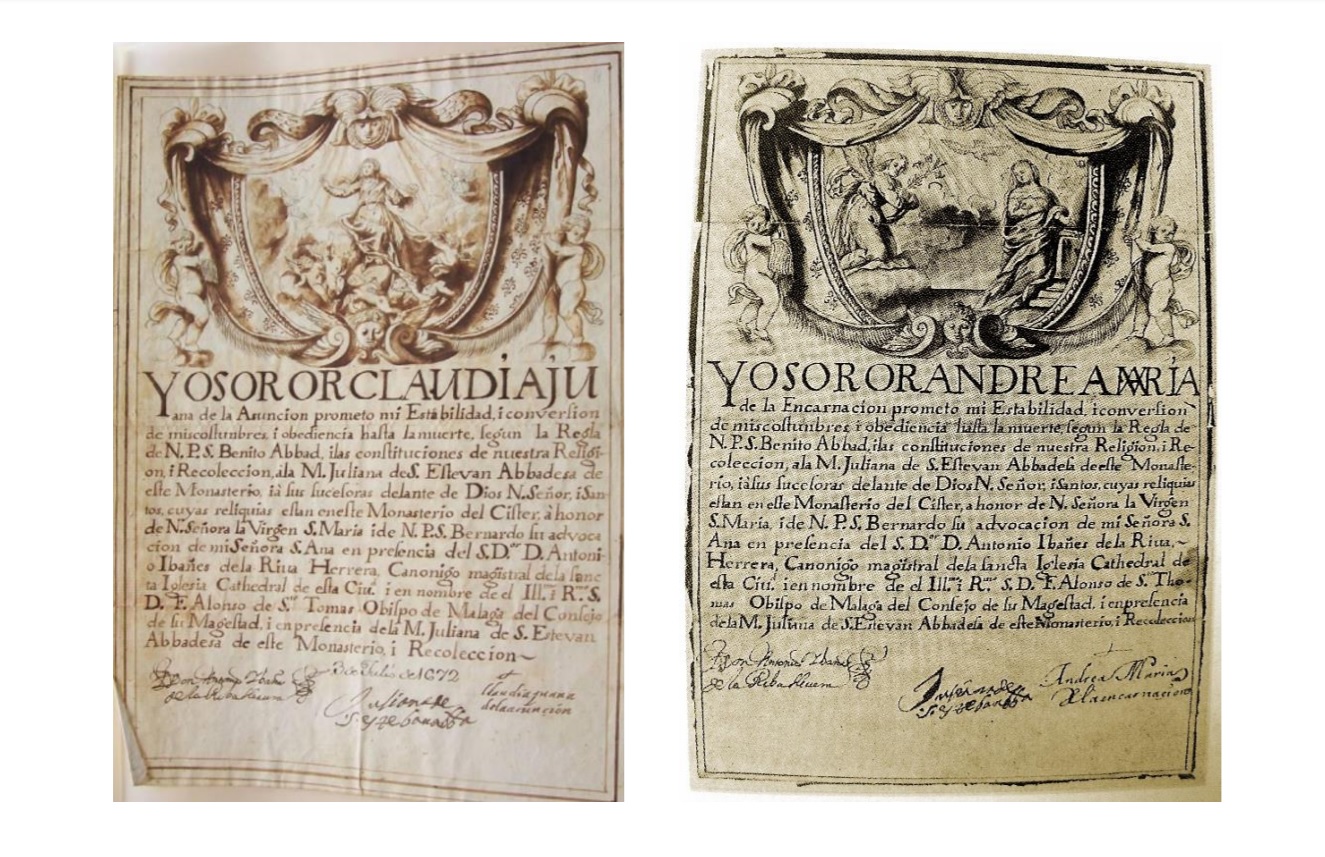 Dentro de los ejemplos, podemos destacar dos modelos de artistas: las hijas de pintores o escultores que, tras haber recibido formación en el taller familiar o paterno, entran en religión, fenómeno muy habitual dentro del ámbito hispánico de la Edad Moderna. Tal es el caso de las hermanas Sor Andrea María de la Encarnación (1654-1734) y Sor Claudia Juana de la Asunción (1655-?) que profesaron dentro de la orden de San Bernardo en 1671 y que son ya conocidas nuestras (ver aquí) por haberse formado en el taller paterno de escultura, siendo pues las hijas de Pedro de Mena y Medrano.