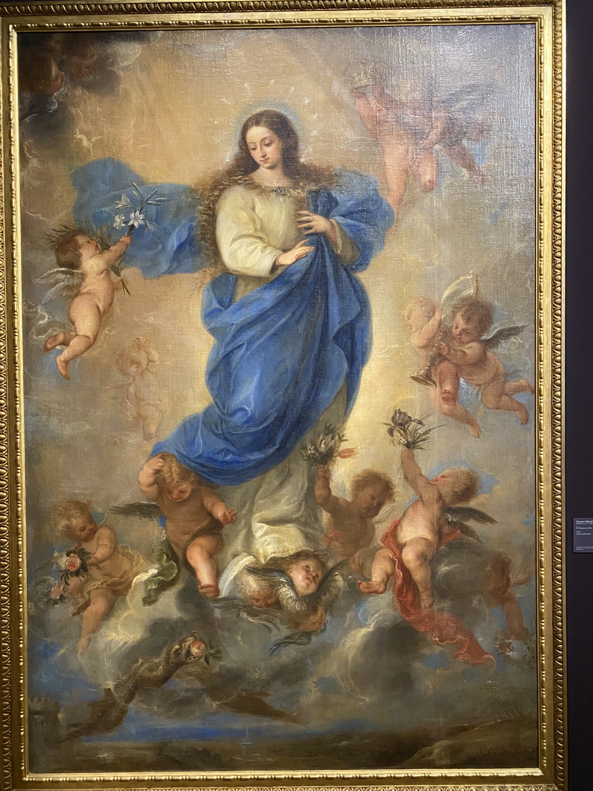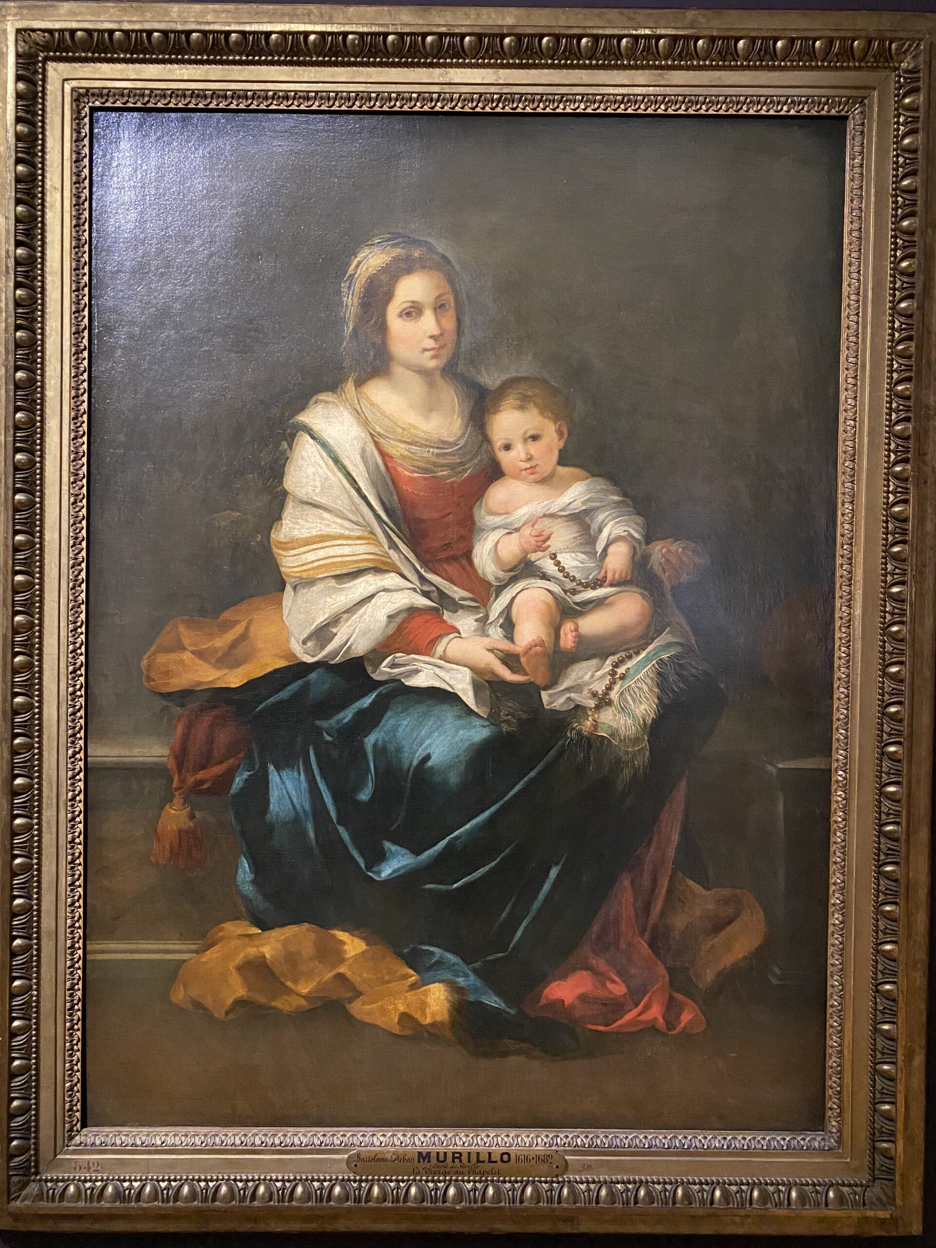 Uno de los conjuntos que más me impresionó fue el de los tres lienzos de Alonso Cano pertenecientes al ciclo de la Virgen María que el artista realizó para la Iglesia del Ángel Custodio de Granada. El colorido, dulzura de rostros y presencia plástica de los tres lienzos deja conmovido en una sala en la que se bate con dos cuadros de enorme calidad de Coello y una de las primeras Vírgenes con el Niño elaboradas por Murillo. Pese a que la obra de Murillo es una de las más destacadas del museo, a mi parecer, presenta una cierta dureza en el rostro de la virgen y en sus paños que me resulta extraña, aunque la factura del Niño Jesús es deliciosa.