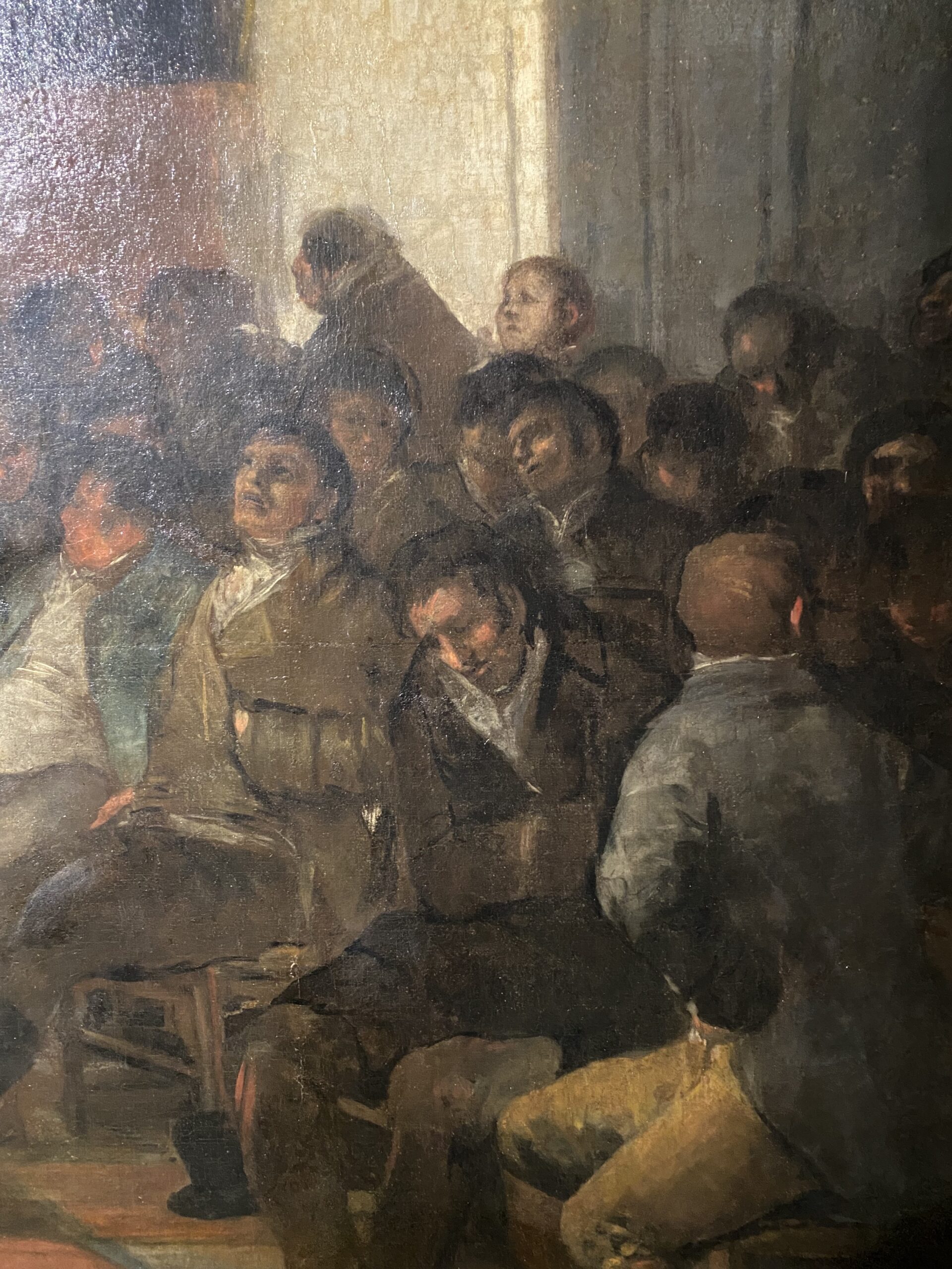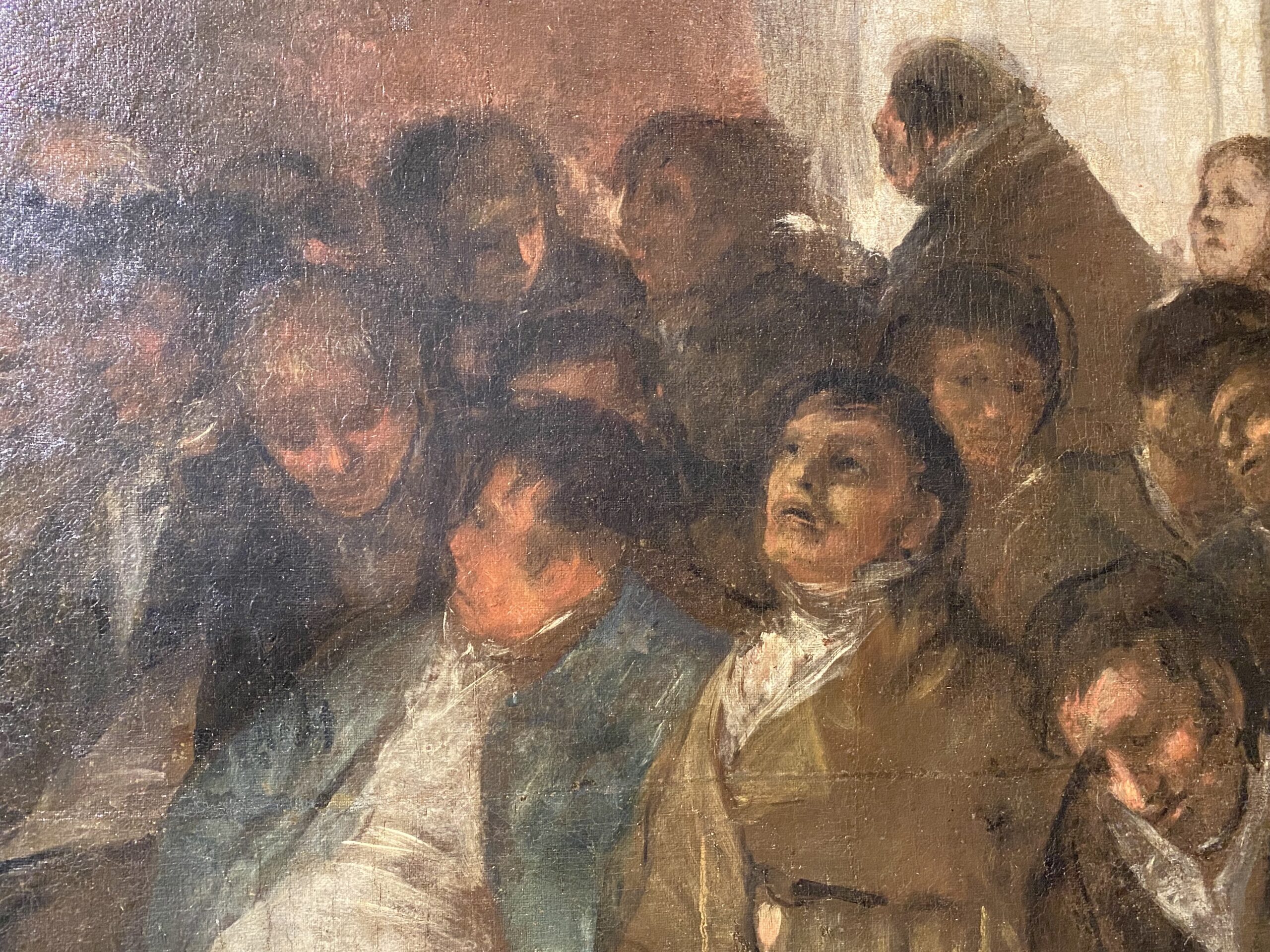 Tras una sala dedicada al siglo XVIII y la naturaleza muerta se llega al otro de los platos fuertes del museo: las salas dedicadas a la figura de Francisco de Goya. Como ya hemos indicado, la donación en 1894 de tres cuadros del artista por parte de la familia Briguiboul es lo que marcó la orientación del museo a la pintura española y es que ciertamente la calidad de las tres pinturas del artista aragonés se encuentran entre las mejores de su producción. Por un lado está el retrato de Francisco del Mazo en el que el artista deja ver su influencia velazqueña a través del fondo neutro sobre el que se recorta el personaje. Está también uno de los mejores autorretratos del artista, en el que se plasmó con anteojos hacia 1800. De este retrato se conservan otras dos versiones, pero esta de Castres es magnífica, mostrando la rapidez de trazo y lo empastado de pigmento del pincel del artista. La profundidad psicológica del rostro del personaje y las calidades que logra transmitir en el atuendo son realmente fantásticas. Pero la obra que más impacta es el colosal lienzo de La Junta de Filipinas (3,2 x 4,3 m). Esta es la pintura de historia más grande ejecutada por Goya. Adquirida en 1881 por Marcel Briguiboul, el cuadro muestra la conmemoración de la asamblea general de la Junta reunida en 1815 y excepcionalmente presida por el rey Fernando VII. La iluminación de fuerte contrastes de la obra, elemento clave de la pintura, bebe de Las Meninas de Velázquez, en un homenaje más del aragonés al sevillano. El espacio se organiza a través de líneas de fuga que llevan hacia el retrato de Fernando VII, que como si fuera el de un de sello o moneda, muestra al rey impertérrito e irreal. No obstante, este es uno de los pocos personajes realizados con precisión, ya que el público que acude a la junta aparece en muchos casos esbozado, delineadas sus formas con trazo grueso negro para después dar toques de color que conforman el personaje. Una forma maestra de dar vida a un conjunto de gentes que muestran su desidia en el acto presidido por el monarca al que están acudiendo. Una crítica nada discreta al soberano que muestra como el artista fue abriendo las puertas a su exilio francés.