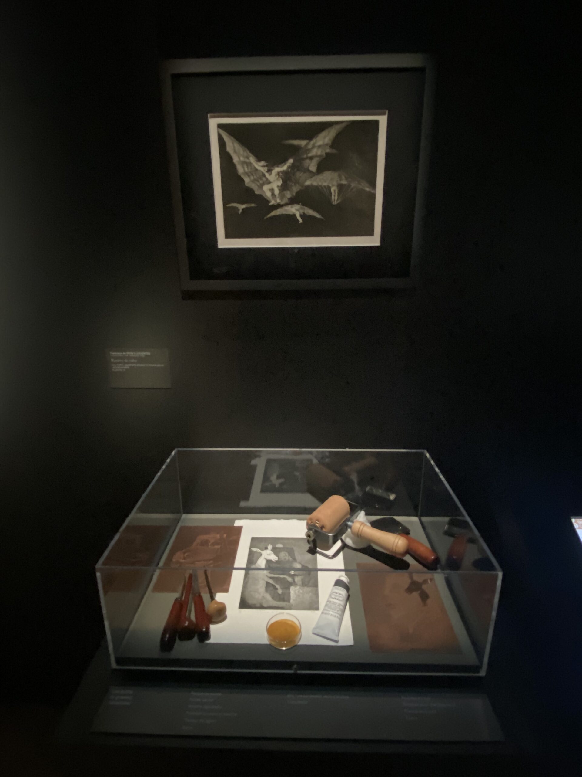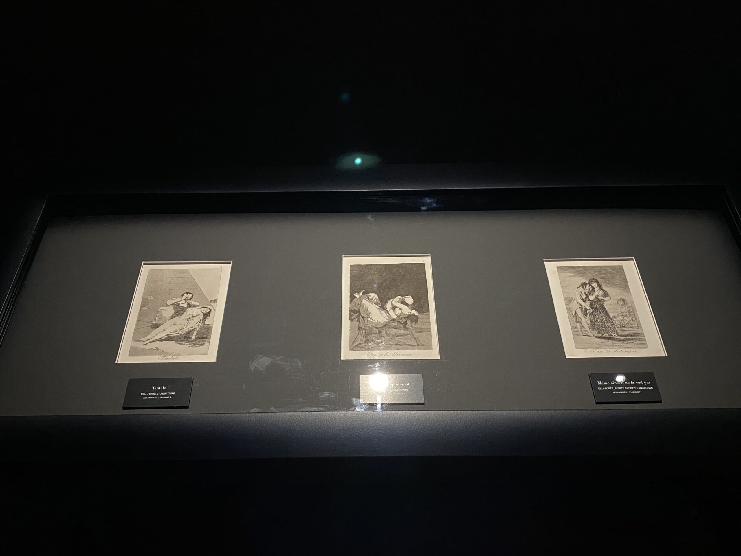 Además de estas tres destacadas obras en lienzo el museo conserva una colección completa de las cuatro series de grabados realizados por Goya: Los Caprichos, Los Desastres de la Guerra, La Tauromaquia y Los Disparates. Así como una serie realizada en 1778 sobre los lienzos de Velázquez de la colección real. El conjunto supera los 250 grabados de los cuales se exhiben, en una sala especialmente dispuesta con luz de intensidad más baja, unas cuarenta obras que irán rotándose para que su conservación no se vea comprometida. La sala se ve complementada con un vídeo que explica el proceso de realización de una plancha de grabado y de la técnica para su reproducción.
