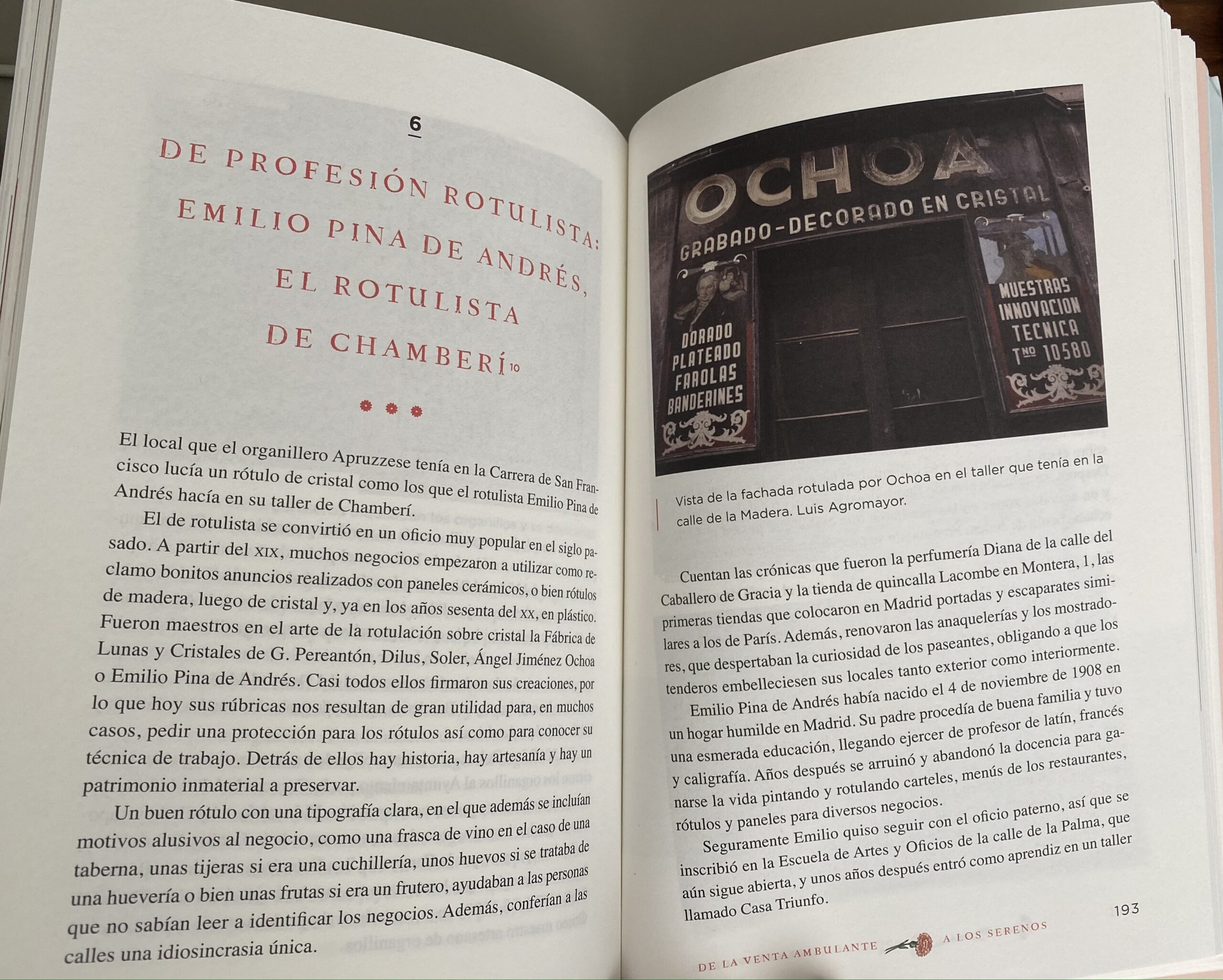 Todas esas historias y muchas más son las que El Sereno de Madrid, nuestra Sonia Taravilla, ha reunido en el libro Por las calles de Madrid, que salió el pasado 26 de abril. Un libro fresco y alegre que nos cuenta todas esas historias no desde la nostalgia, sino desde la curiosidad, la documentación y el anhelo de que conociéndolas todos queramos proteger los vestigios que todavía quedan en nuestra ciudad del pasado. Los amantes y estudiosos ya conocerán a muchos de los personajes de los que Sonia habla en sus páginas como la modista de la reina, Vicenta Mormin, al fotógrafo Alfonso o al rotulista, Emilio Pina. Sin embargo, para muchos, incluyéndome a mí, muchos de los personajes e historias que cuenta en su libro me eran completamente desconocidos y me han permitido conocer un poco mejor nuestras tradiciones y el modo de vida de nuestros antepasados.
